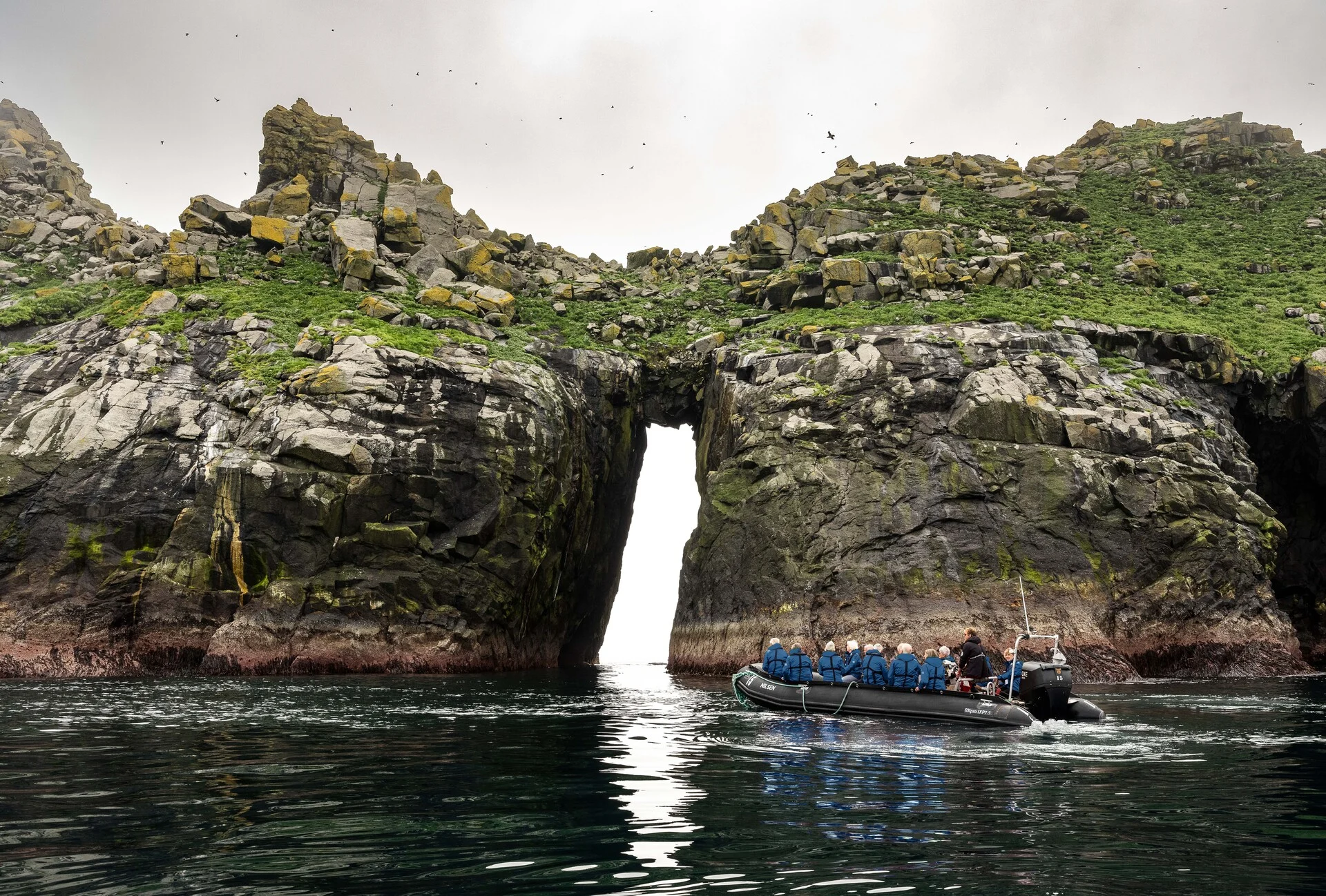 If conditions allow, we’ll also sail to Staffa. We’ll attempt to take our small boats for a closer look at Fingal's Cave, marveling at the hexagonal basalt columns, superb natural acoustics, and mesmerizing, colored waters.