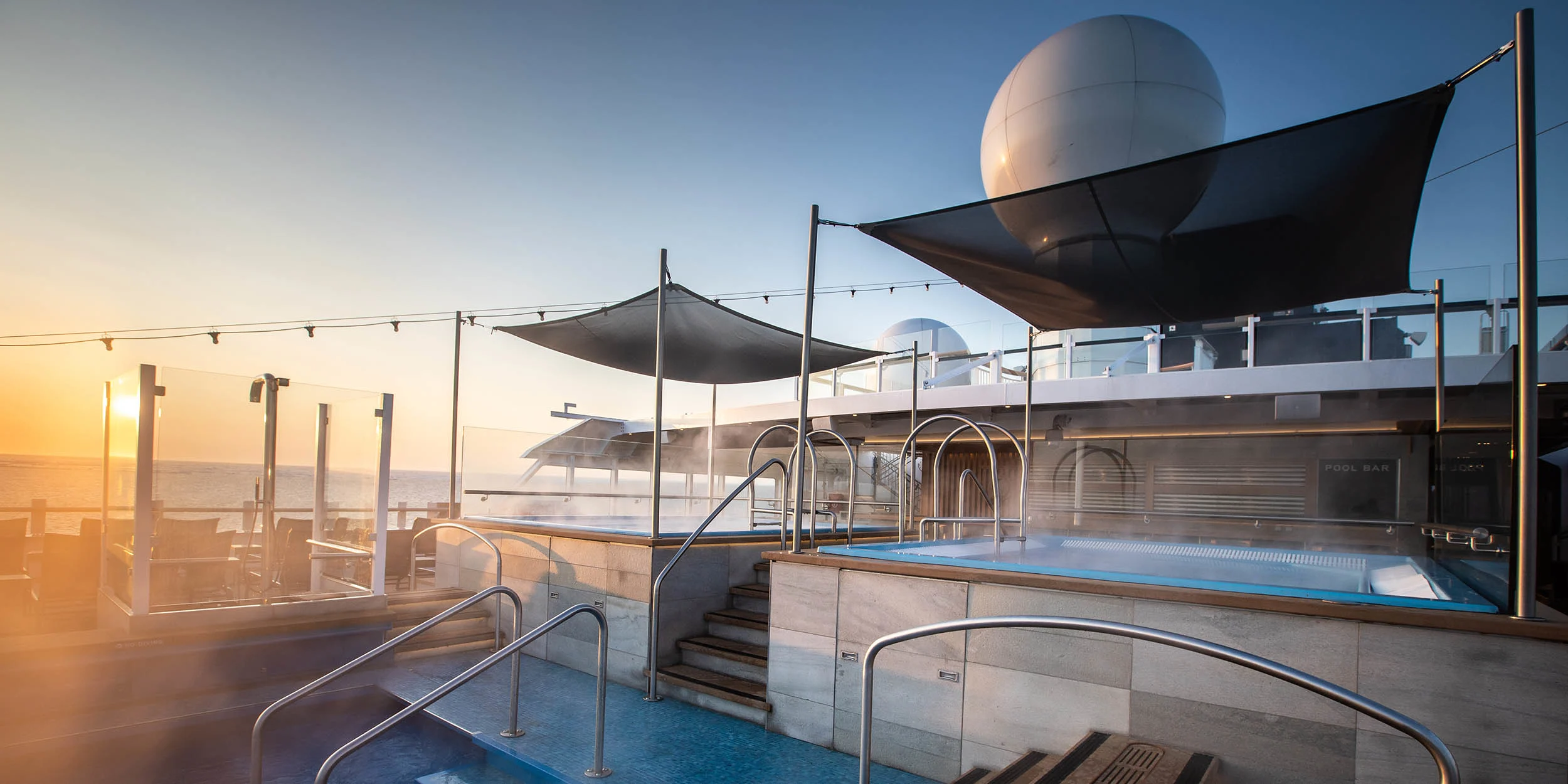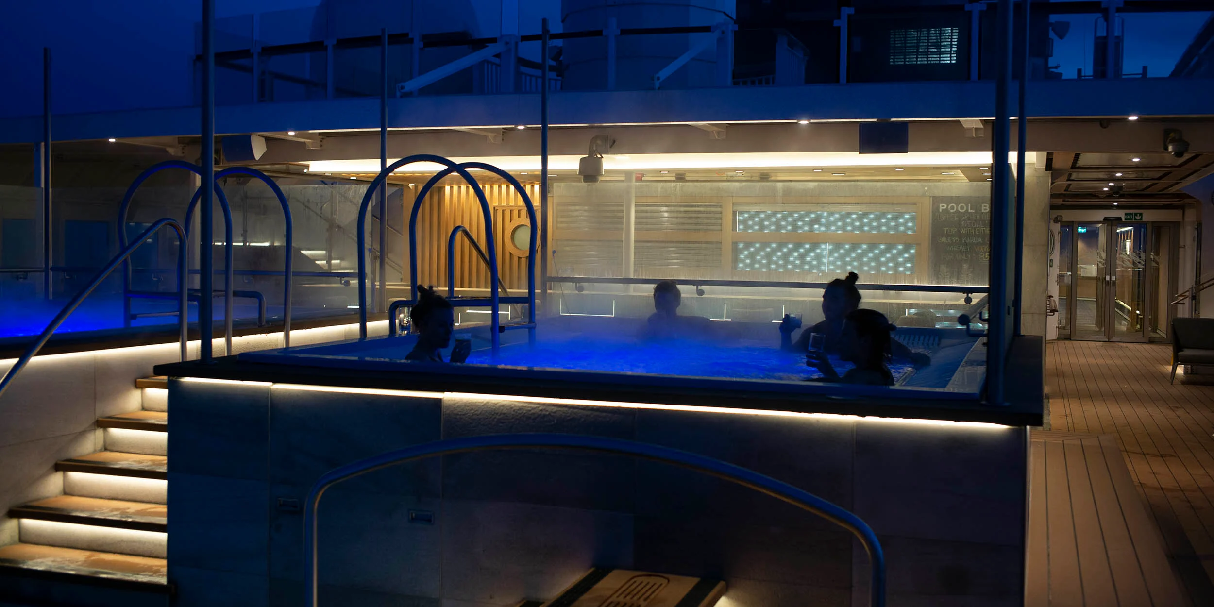 Passa även på att utnyttja fartygets bekvämligheter. Koppla av i infinitypoolen, badtunnan eller bastun – eller motionera på fartygets inomhusgym eller löparbana. Framåt kvällen kan du prata om alla upplevelser och njuta av panoramautsikten i Explorer Lounge & Bar tillsammans med dina medresenärer.